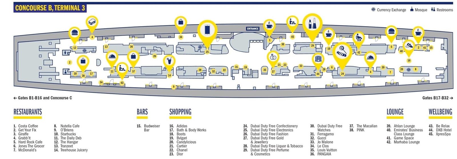 - Hair Dryer: In Concourse A, attached to the shower area. In Concourse B, available within a 2-minute walk.